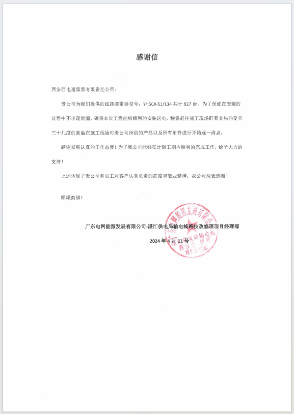 广东电网能源发展有限公司-湛江供电局的感谢信是对我公司在该工程履约、服务工作方面的高度认可,充分体现了客户对西电避雷器服务人员的肯定与赞扬,更激励着我们继续不断提升服务质量和卓越表现的决心。我们将继续秉承中国电气装备集团全力打造“世界一流智慧电气服务商”的目标,全力践行六个一流,成为行业一流企业。